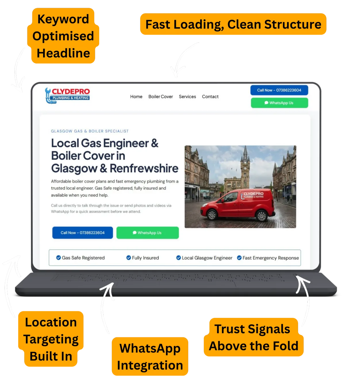 Scotland-based, UK-wide. We build websites that get your business found, trusted, and chosen. Keyword research, schema markup and automation included as standard.